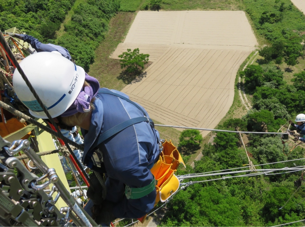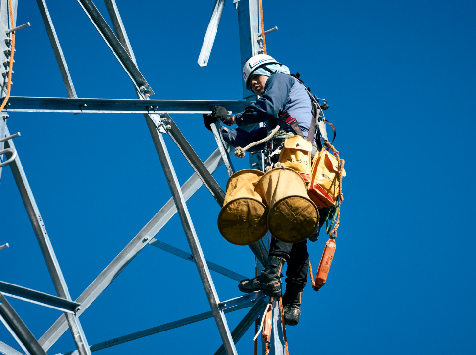 鉄塔や送電線の建設・点検・保守を行い、街や暮らしに電気を安定して届ける仕事です。 山間部や市街地に立つ鉄塔に登り、高所での作業や専門的な技術を駆使して、電力インフラを支えています。